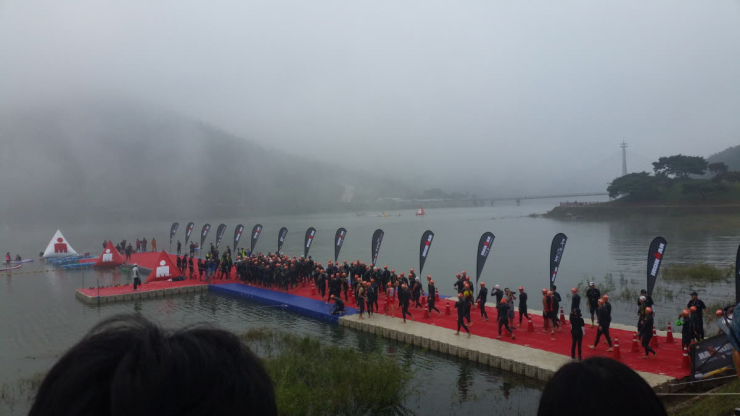 대회 당일인 9월10일 오전6시40분, 지리산 호수에는 대회 참가자들과 이들을 응원하러 온 지인들로 이른 새벽부터 인산인해를 이뤘습니다. 서울트라이 팀, 14명의 참가자들은 연초부터 쌓아온 훈련을 바탕으로 완주를 위해 온 힘을 다했습니다.