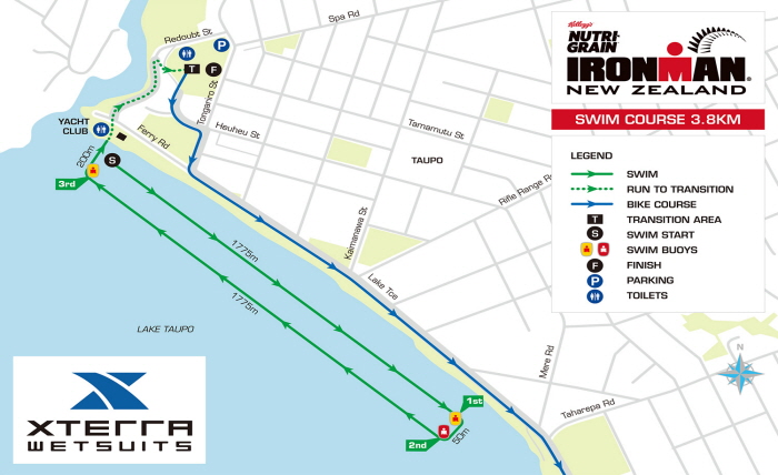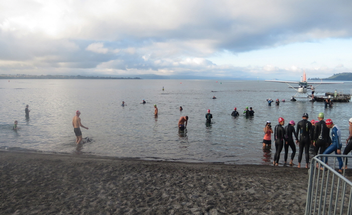 수영 장소인 타우포 호수는 생각보다 물이 차다. 모든 선수가 웻-수트를 착용한다. 호수지만 바다라 느껴질 정도로 넓다. 바람에 따라 큰 파도가 치기 때문에 파도 흐름을 잘 읽고 넘어가야 한다. 수영 후 제1바꿈터까지 달리는 거리가 500m정도로 꽤 멀다. 때문에 수영 후 바꿈터에 이르기까지 체력안배가 필요하다.