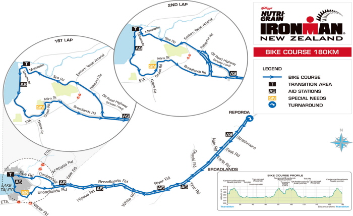 도로 노면 상태가 좋지 못하다. 잔돌이 튀기도 한다. 따라서 노면 상태를 이해하고 바이크를 진입하는 것이 좋다. 코스는 타우포 호수 주변의 울창한 나무숲 주변의 도로를 2바퀴 도는 형태다. 코스를 따라 펜스 주변에 수많은 갤러리들이 열띤 응원을 펼친다. 특히, 올해 뉴질랜드 시합은 수영 시작부터 바람이 무척 강해 코스별 맞바람 구간에서 속도가 늦춰진다. 이번 대회에서 최고속도 70km/h, 평지 최저속도 17km/h까지 나온 것을 보면, 그 맞바람의 세기를 짐작할 수 있다. 이처럼 아이언맨 시합 당일의 날씨는 레이스에 큰 영향을 끼친다. 하지만 원하는 성적으로 완주한다면 그만큼 성취감은 더 커진다. 자신과의 싸움을 이겨낸 선수에게 잊지 못할 추억이 하나 더 생기는 것이다. 한편 이곳은 자연 경관이 무척 아름답다. 온몸으로 자연을 느끼며 경기에 임할 때 묘한 쾌감이 느껴진다.