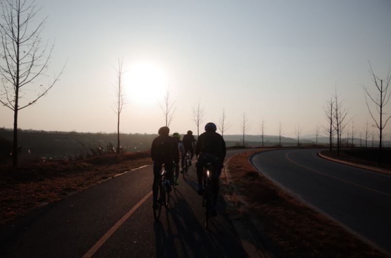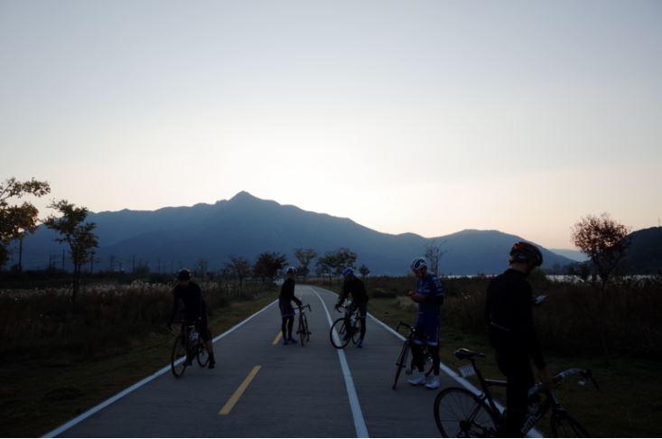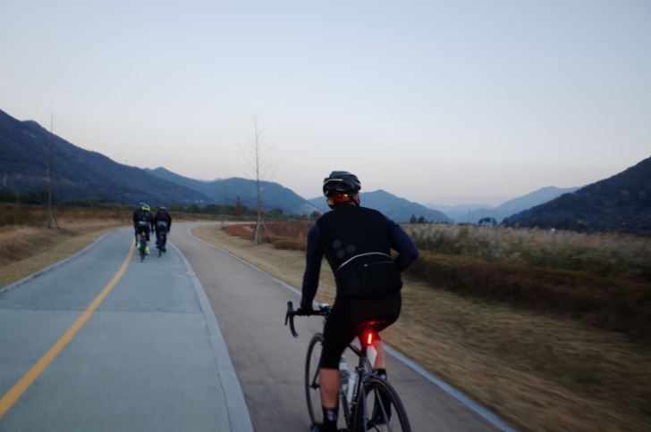 어둑어둑한 시간에 우리 팀도 준비를 마치고 아름답고 조용한 낙동강 자전거길을 느끼며 간다.