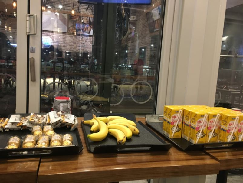 힘겹게 도착한 라이더들을 위해 바나나 초콜릿 말고도 샌드위치, 햄버거, 뭐 아무튼 엄청 많은데 다 먹었습니다.