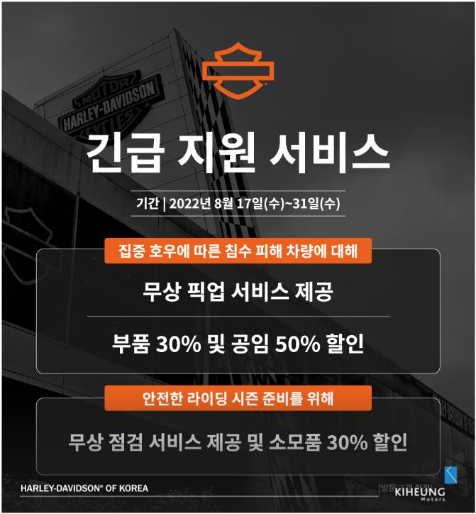 할리데이비슨 코리아는 8월 17일(수)부터 8월 31일(수)까지 이번 집중 호우로 침수 피해를 본 모터사이클에 대해 무상 픽업 서비스를 제공하며, 침수 피해로 인한 수리비 중 부품은 30% 할인, 공임비는 50% 할인을 진행한다.