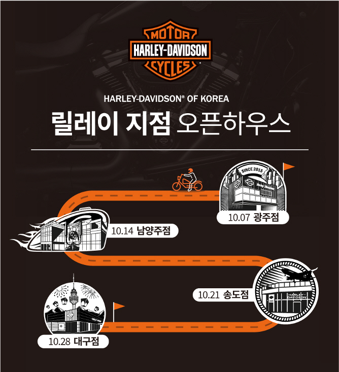 ‘릴레이 오픈하우스 이벤트’는 10월 7일(토) 광주점을 시작으로 10월 14일(토) 남양주점, 10월 21일(토) 송도점, 10월 28일(토) 대구점 순으로 진행된다. 해당 기간에 매장을 방문하면 할리데이비슨 코리아에서 준비한 다양한 이벤트를 즐길 수 있다.